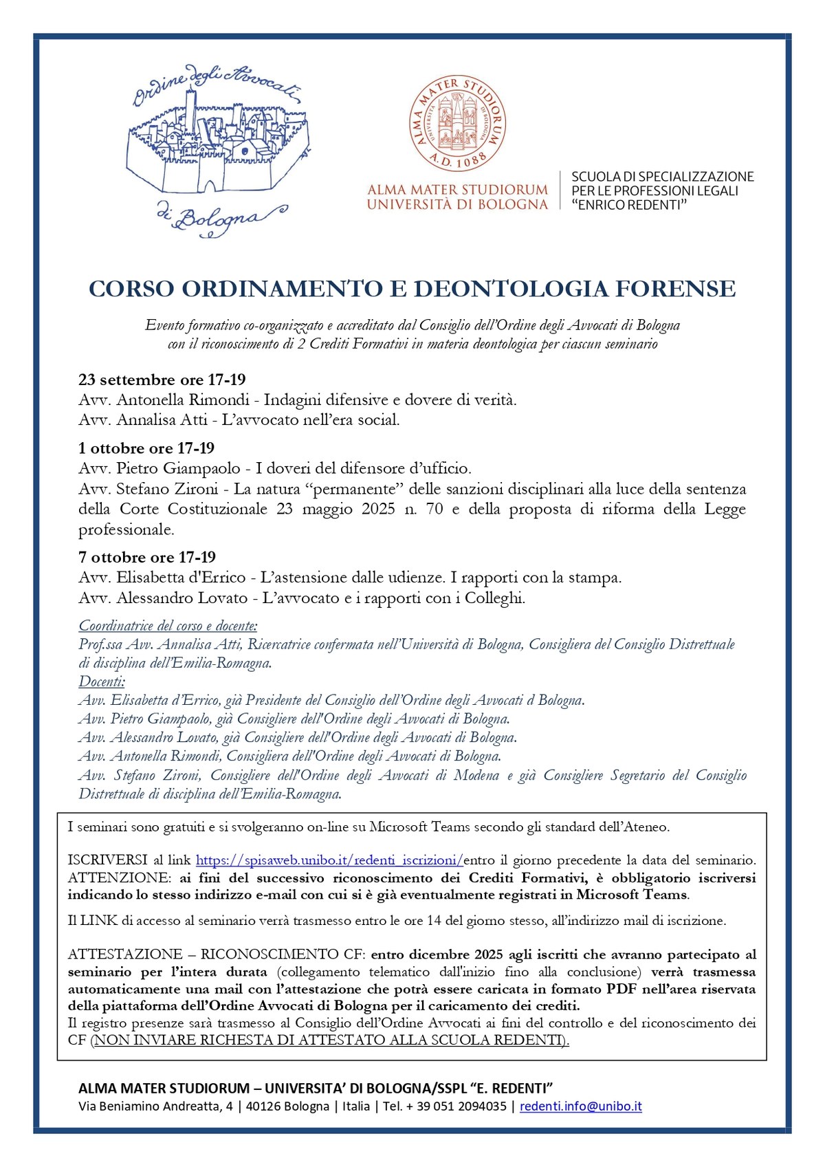 ATTESTAZIONE – RICONOSCIMENTO CF: entro il mese di dicembre 2025 agli iscritti che avranno partecipato all'evento per l’intera durata (collegamento telematico dall'inizio fino alla conclusione del seminario) verrà trasmessa automaticamente una mail con l’attestazione, che potrà essere caricata in formato PDF nell’area riservata della piattaforma dell’Ordine Avvocati di Bologna per il caricamento dei crediti (NON INVIARE RICHESTA DI ATTESTATO).